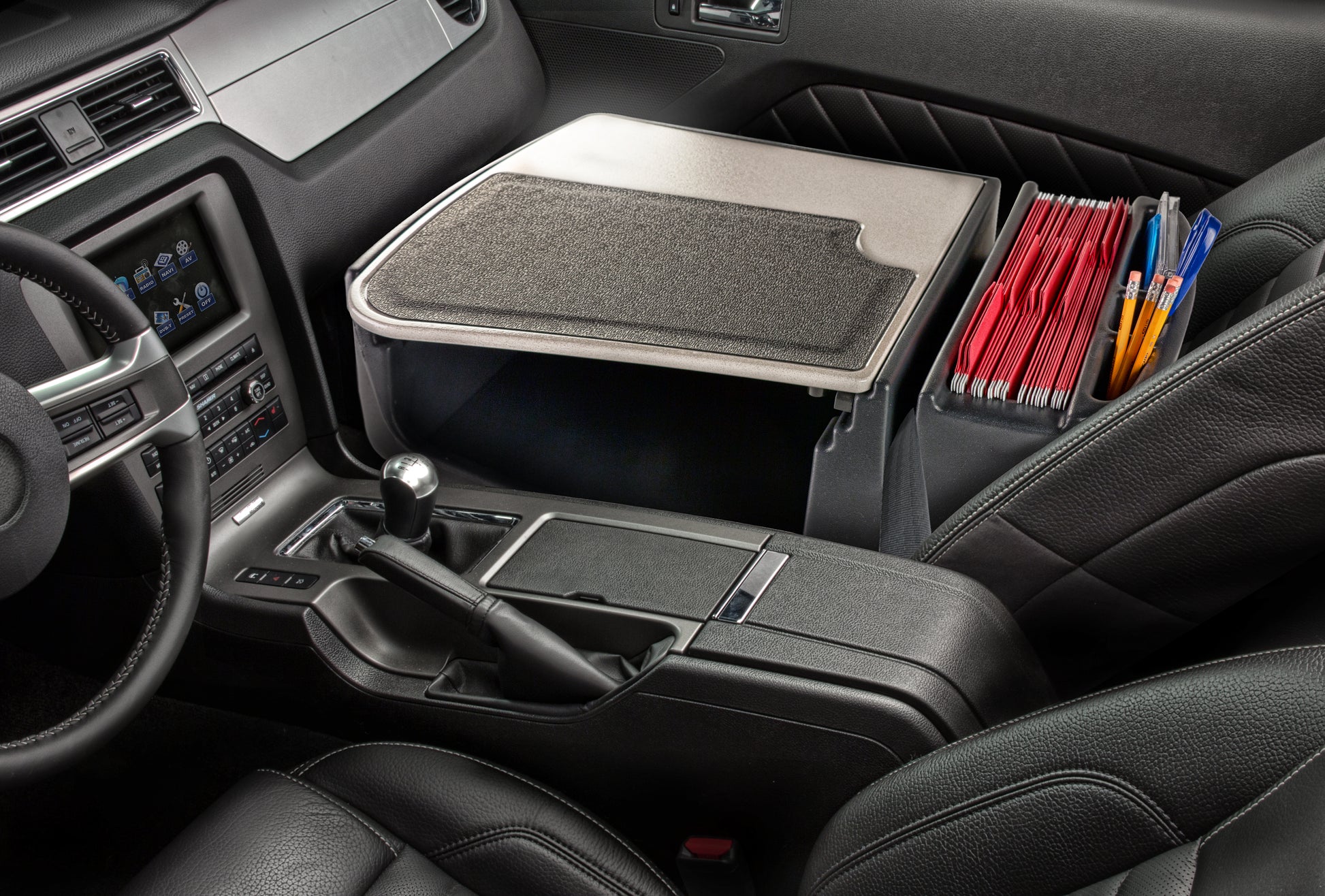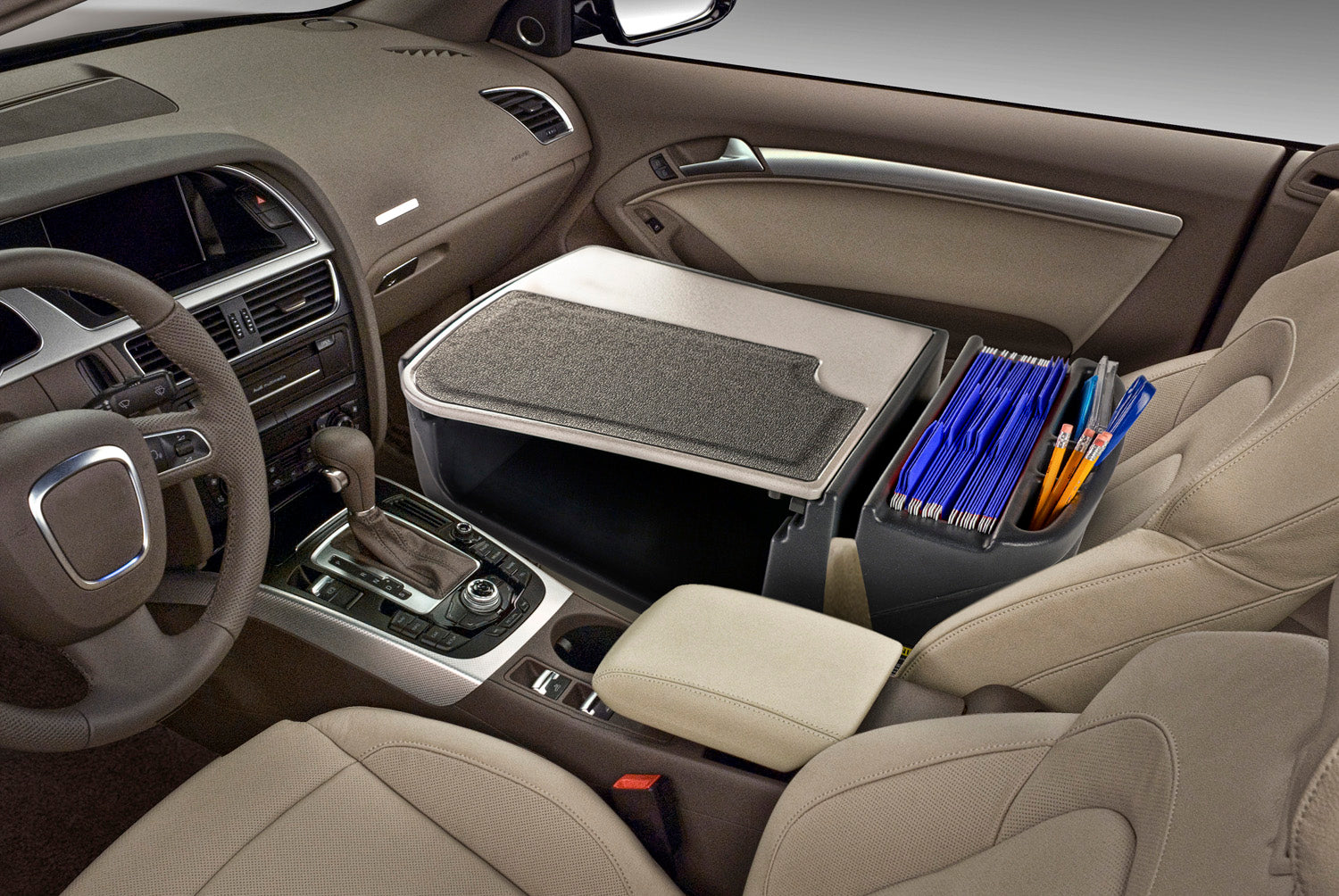 - Increase productivity by keeping your vehicle organized and efficient with the large work surface and smaller storage compartments located towards the back of the car desk